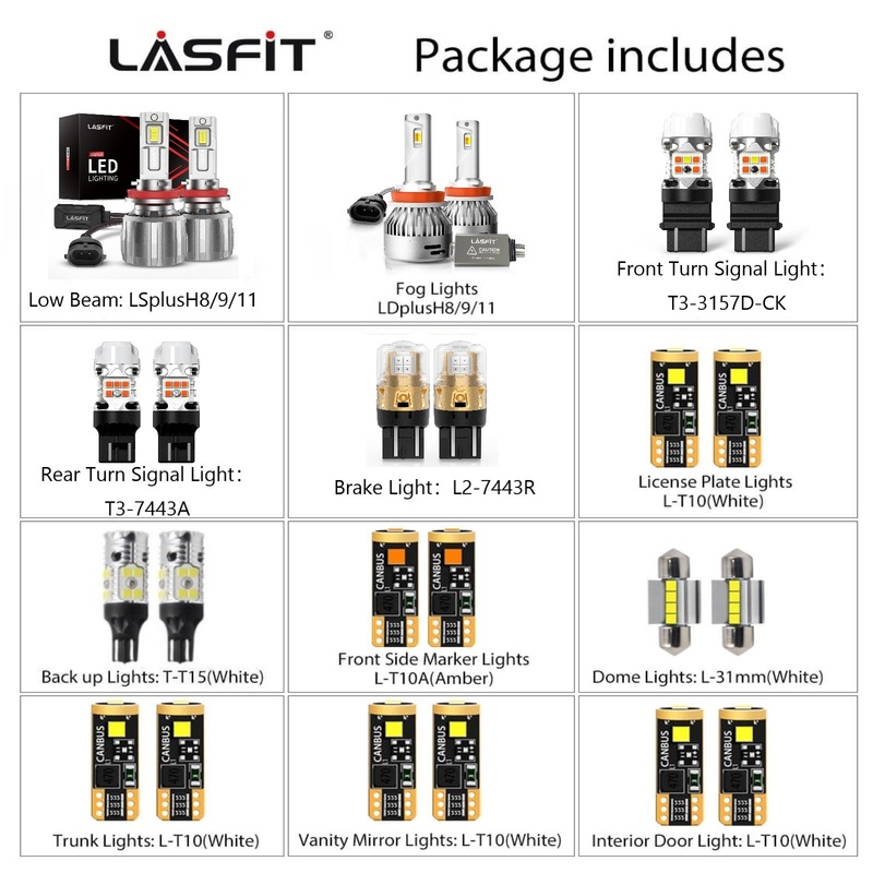 1> Front Turn Signal Lights: 3157/ 3457 switchback, T3 series, built-in Canbus anti hyper flash function. T series LED bulb is specially designed for turn signals, built-in resistor function works perfectly with the vehicle computer system.